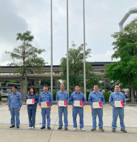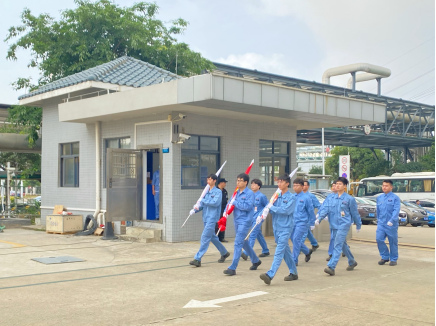 7點35分,參加升旗儀式的員工統一著工裝,面向升旗臺集合列隊。隨后,旗手和護旗手踏著雄壯有力的步伐護送國旗就位。伴隨著國歌響起,全場員工莊嚴肅穆地面向國旗行注目禮。